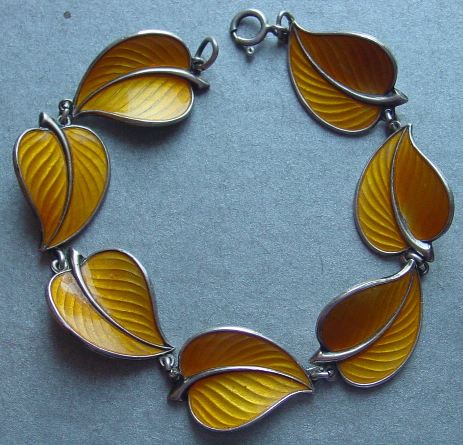 Anyway, the beautiful leaf bracelet above is by Bernard Meldahl (I’ve also seen it spelled Meldah), an Oslo-based designer who specialized in enamelled jewels. Meldahl’s studio closed when he died in 1950, but his designs continued to be produced by Hans Myhre through the next decade. The mark on this bracelet pre-dates that time, however.