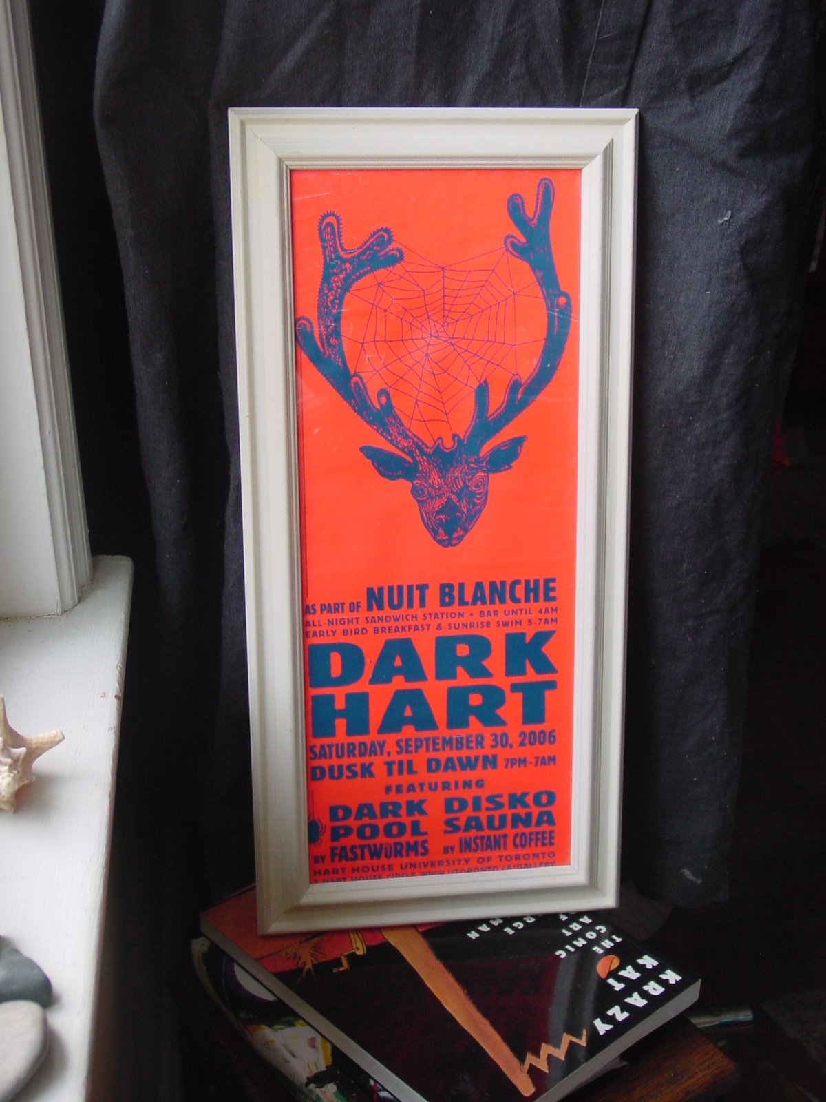 Yesterday I totally lucked out with a long thin frame for this Fastwürms/Instant Coffee poster I picked up at the first Nuit Blanche. Yes, it took three years to find a frame that worked for this print. And yes, I still had to fold over the bottom bit to make it fit. But the poster was kinda mangled after three years of sitting rolled up in a box with all the other ephemera, so I don’t feel too bad.