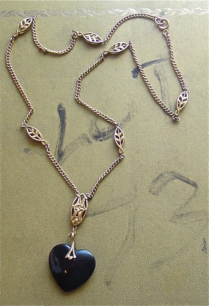 I am in mourning, so today’s heart is a black one. A black coral pendant and a nice gilt art nouveau chain that was a gift from the lovely Lynda Felton. For those who believe in the healing powers of gemstones, black coral is said to grant serenity and peace while absorbing negative energy.
