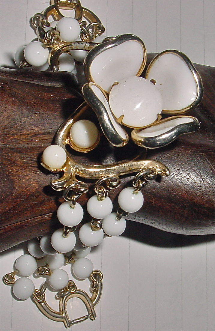 Retro Milk Glass Flower Bracelet — About 10 years ago, Drew Barrymore wore a vintage costume jewellery floral cuff to the Academy Awards. Ever since then, I’ve wanted to have a flowery bracelet that was pretty enough to wear to the Oscars. This one is pretty well worn, but I’m totally going to wear it to an Oscar party.