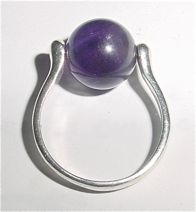 What happened was that I had this Elsa Peretti Open Heart knock off ring. The heart was set on pivots so it would flip over, but it kept coming off. One day, on Valentine’s Day, the heart fell off and I couldn’t find it. The shank sat on my desk for a month until I thought: Hey! I have some nice amethyst beads. Why don’t I pop one of those babies in there.
