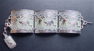 Part of the fun of finding cool vintage stuff is researching it. On Friday, I picked up this pretty panel bracelet, stamped with a Japanese-style scene of cranes in front of Mt. Fuji. The hanging pendant is stamped “Made in Germany.” It’s made of a goldtone material that’s super light. Like aluminum.