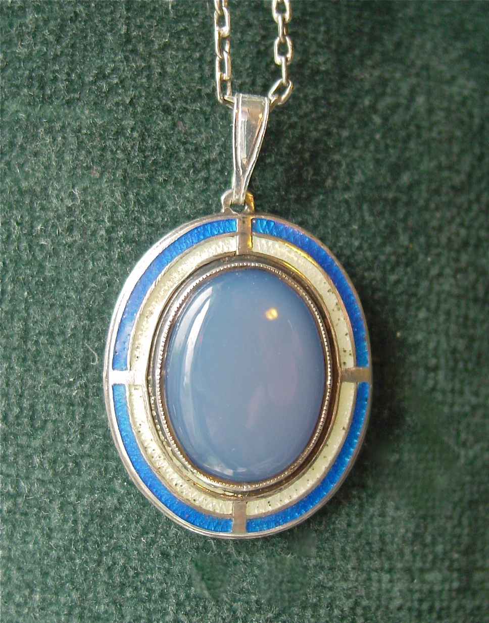 Here is the last of my discoveries from last Friday’s trip to the Value Village. This Art Deco era enamel and lavender chalcedony pendant was particularly sweet because I stopped in at Rozaneh‘s before I hit the VV. She had a beautiful carved jade Deco pendant, but was asking $65. A very fair price for such a pretty piece, but not one that I could afford to pay.