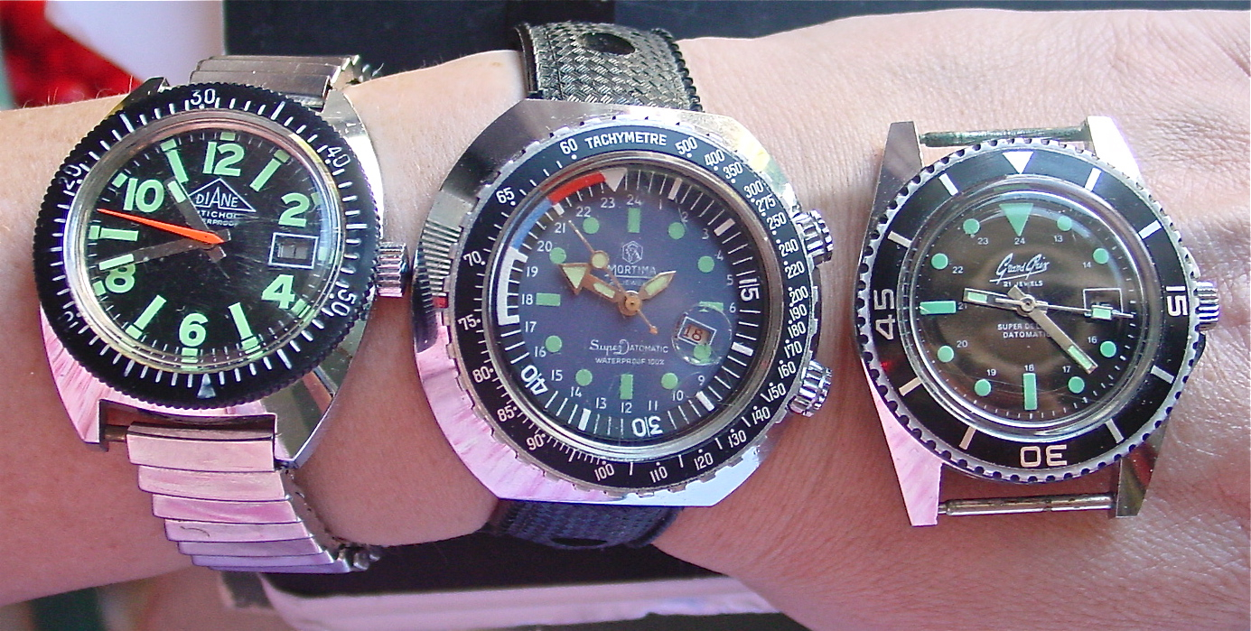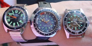 Check out my vintage deep sea diving watch collection. Aren’t they sexy? Of course, you probably shouldn’t actually try to scuba in a 40-year-old watch. The seals and stuff that make them waterproof have probably long disintegrated.