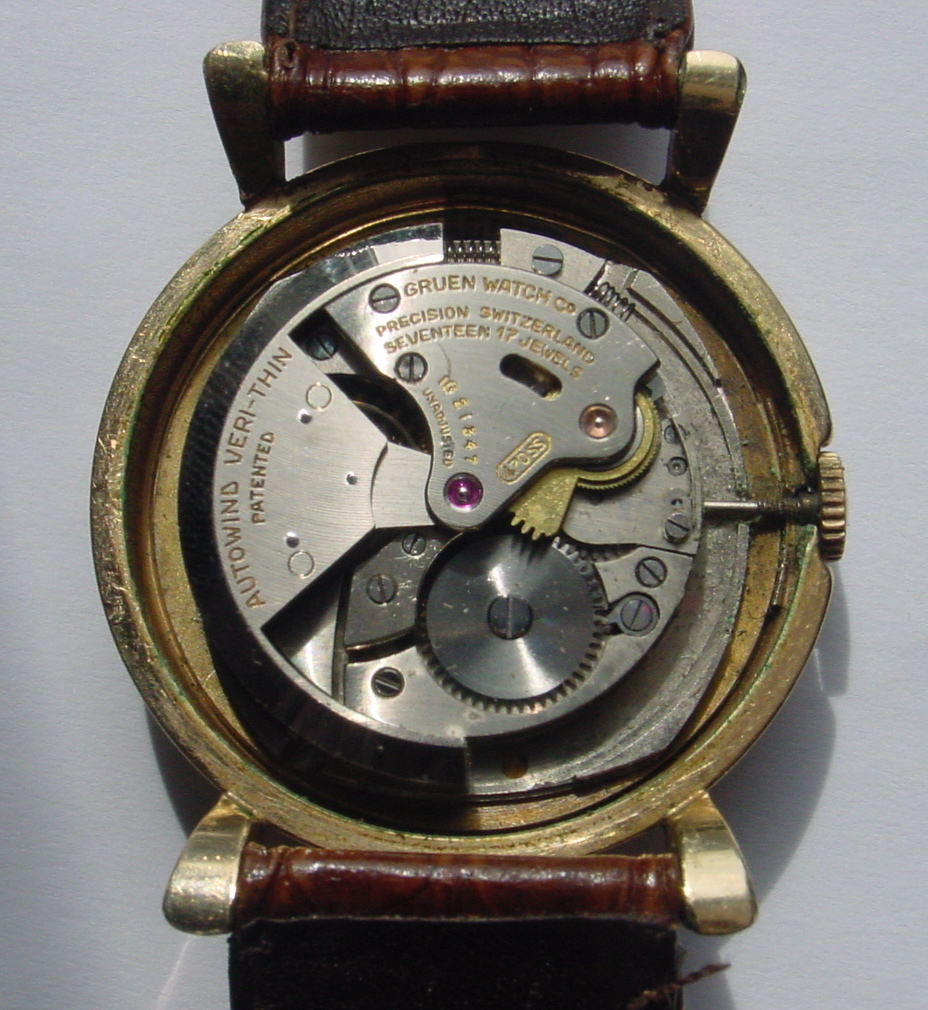I’ve had automatic watches before, but this Gruen Precision is my first bumper automatic. Automatic watches uses the movement of the wearer’s arm to cause a semi-circular rotor to pivot back-and-forth and wind the watch “automatically.” Most autos rotate a full 360° but bumpers (or hammers) only move 180° — hitting a small bumper at each end of its path of travel.