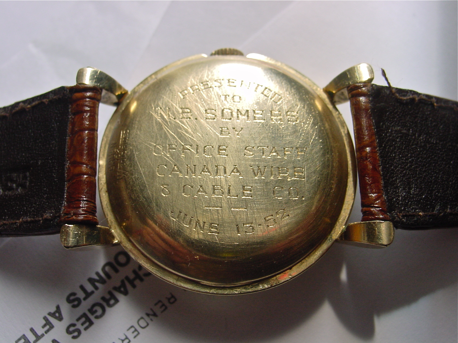 I’m not sure when they stopped making bumpers, but I’m thinking not long after this watch was made. The original Gruen Company shut down in 1958. Another interesting bit about this watch is the inscription on the back, which reads:
