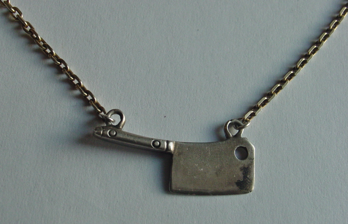 Sometimes you have two things that don’t quite work on their own. In this case, I had a nice, weighty vermeil necklace that at 16 inches was too tight around the neck for my liking. And I had this cool meat cleaver doodad that used to hang from an old, broken tie clip. So I used the two-ish inch chopper as an extender.
