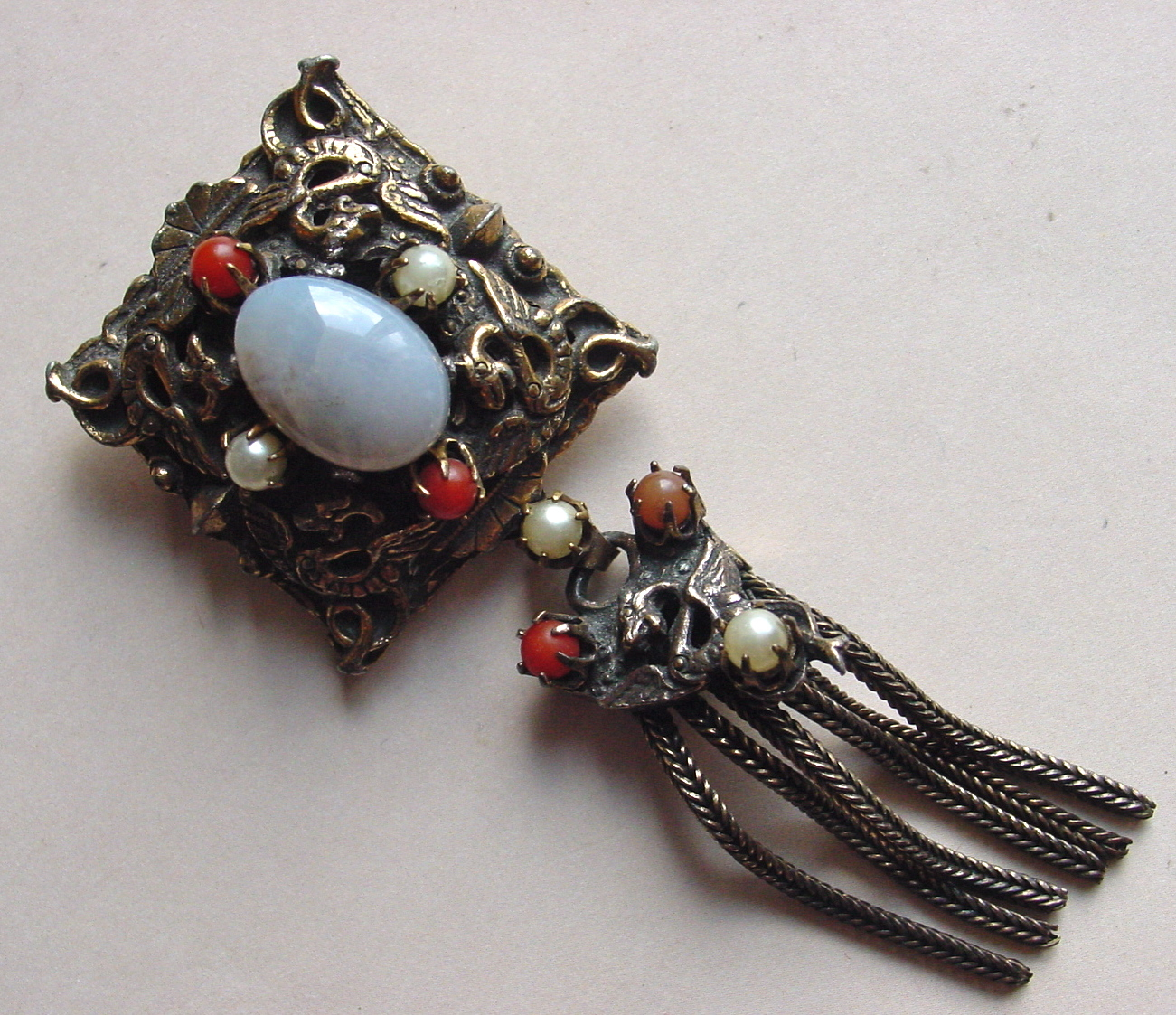 I say its Nouveau-ish because it has many design motifs of Art Nouveau-era jewellery — mythical hybrid creatures (like this Ampithere) and translucent stones, for example. But its made from mass produced materials and Nouveau like Arts and Crafts was a reaction against the machine age. It also has a rollover clasp — a hardware that didn’t really catch on until around 1910, by which which time the Art Nouveau movement was in its last days.