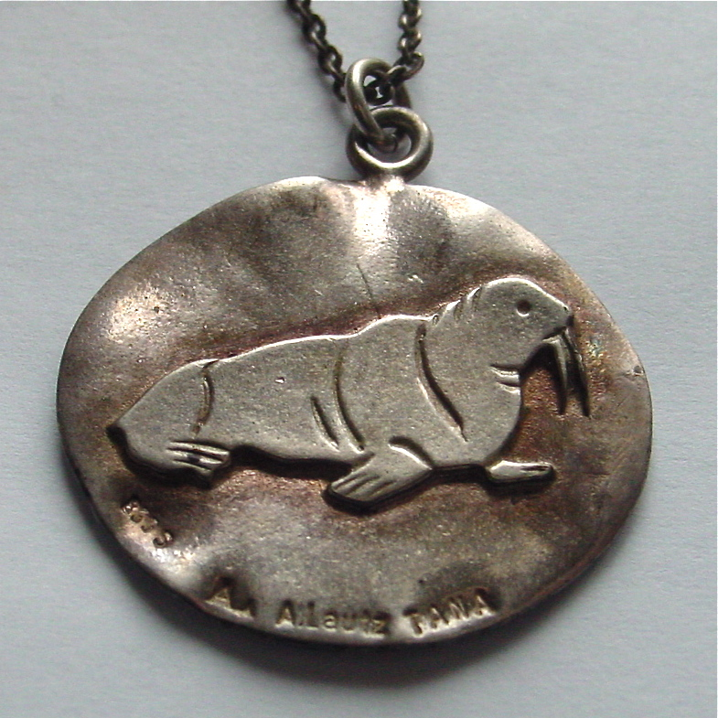 Andreas Lautz is a silversmith in Tana in Northern Norway. His designs are influenced by the Sami people which inspired the design of the seal. But wait! Turn the pendant over and you’ll see a more Western-style walrus!