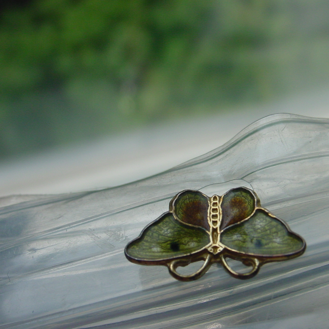 Anyway, I found this teensy pin last month and only got around to taking a picture of it this morning. Then I went to the Value Village on my way to class this evening and lo and behold I found a larger Hroar Prydz butterfly brooch! For $2! Here is a photo of it in all it’s late-night, washed out flash photography glory. Check out the translucent colouring of the enamel and the cute little spots and delicate veins running through the butterfly’s wings. Even the tiny pin has such exacting details.