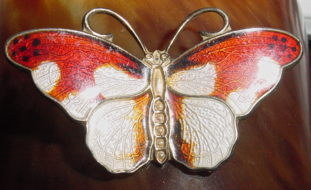I found this pretty little tie tack (pictured above) at the Sally Ann in Southampton last September. It is by Norwegian silversmith Hroar Prydz (what a name!). These basse-taille butterflies were insanely popular amongst Scandinavian silversmiths in the ’50s and ’60s — search for enamel butterfly on eBay and you’ll find offerings by David Andersen, Askel Holmsen and Volmer Bahmer to name but three. Enamelling was a particular specialty of the Scandinvians. Peter Carl Fabergé made his famous enamelled eggs using a workforce of Swedes, Danes and Norwegians. And thanks to designers like Georg Jensen, silversmiths were drawn to themes from nature.