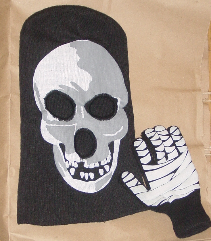 This year, the Dollarama didn’t have any skeleton mitts, but they do have the cool skull balaclava and mummy gloves pictured above.