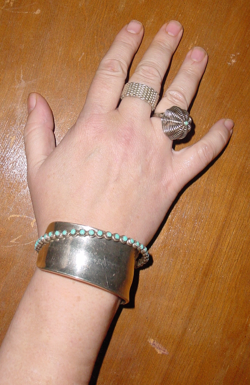 Yesterday morning, however, I found this striking cuff nestled amongst a bunch of decorative glass stones and something called a “Scumbuster.” It’s marked TH 117 MEXICO 925. According to the Online Encyclopedia of Silver Marks, Hallmarks & Makers Marks, Mexican Silver division, these marks indicate that the bracelet was made after 1979 (when this form of assaying was introduced). The “T” in “TH” means that the bracelet was made in Taxco. The “H” is the maker’s initial.