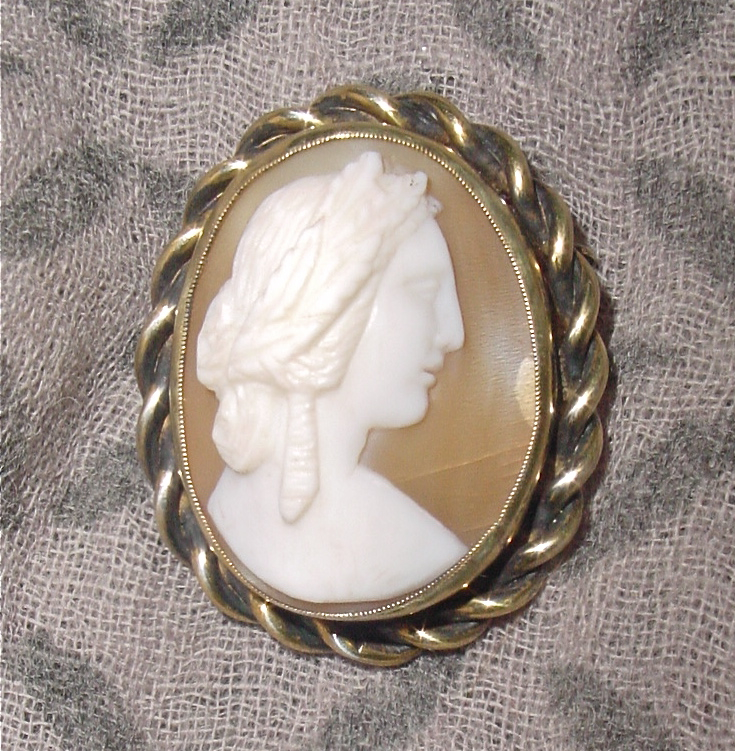 There was one such lady at the Value Village yesterday. She employed both the shopping cart and the coat trick. I went back after she left and found this shell cameo in a low-karat gold frame. I’m guessing the cameo is Victorian because the style of the hair and the classical profile are usually found in cameos of the early and mid 1800s. The brooch frame is definitely newer, but that’s not uncommon: According to my V&A book, folks who were on the Grand Tour in the 1800s would buy the cameos as souvenirs, but they would often be set in one piece of jewelry and when styles changed, reset in another.