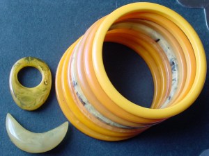 At one point, I was an active collector of Bakelite. Mostly plastic handled flatware. If you don’t know, Bakelite is a trade name of polyoxybenzylmethylenglycolanhydride — one of the first thermal plastics. Bakelite was used for lots of things: making radios; mah jong tiles; insulators for electrical components. In the ’20s until the ’40s it was also used to make brightly coloured jewellery.