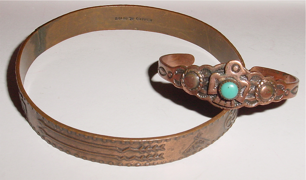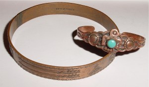 Not all Navajo jewellery is silver. Below are two copper pieces that I have, both signed Bell Copper. Founded in Albuquerque, New Mexico in 1935 by Jack Michelson, Bell Copper (aka Bell Trading Post) made jewellery for the tourist trade. Navajo artisans made the jewellery, but it made with less expensive materials with “typical” native motifs (check out the thunderbird, tipis and bows) and a lightweight design that could be more easily reproduced. They then sold them at truck stops and trading posts along the interstates of the south west.
