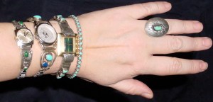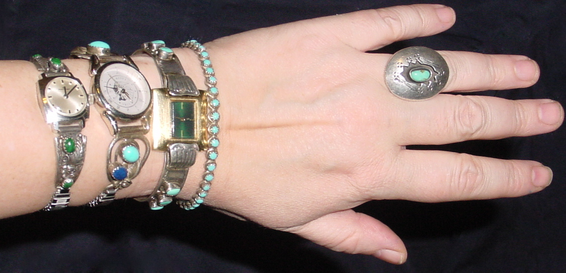 As a crazy watch person, of course I would have to have a selection of bejewelled watch tips. The watch cuff on the far right is signed W. Long. The one set with Malachite is signed with a thunderbolt. The one set with turquoise and lapis has marks I can’t make out.