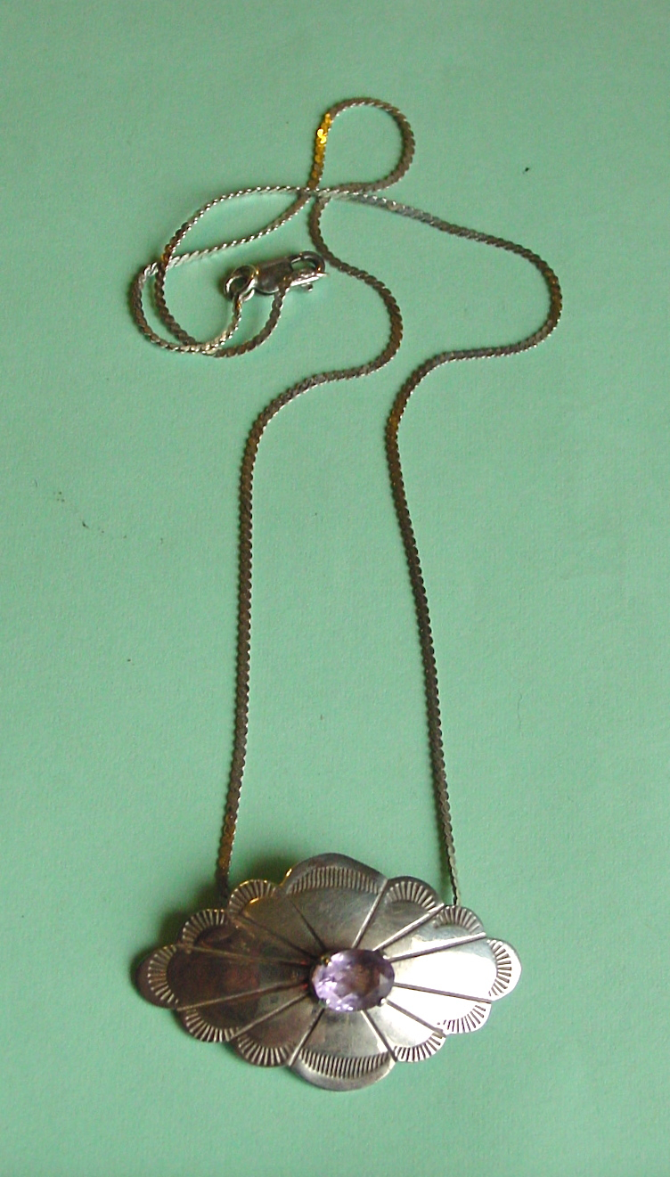 The bangles pictured above are of a newer vintage and at least one is Navajo-made (one is signed TAHE). I have more, I just don’t have good photos of them. Below is another Navajo beauty — an amethyst pendant signed T&R.S.