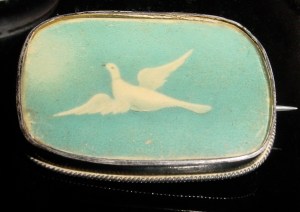 Here is my newest oldest bijou. It is a tiny water colour of a dove painted on Ivory which dates to the late 1700s, early 1800s. In the days before photography, folks would carry tiny, portable portraits of loved ones — many of these images were fashioned into jewellery. The Georgians were a sentimental lot, and a lot of these miniature portraits contained a lot of symbols to further denote their feelings toward the person in the picture. And sometimes the picture would just be reduced to the symbol, in this case, a dove. In the Georgian era, the dove carried both religious and sentimental meaning, signifying peace, gentleness and purity.