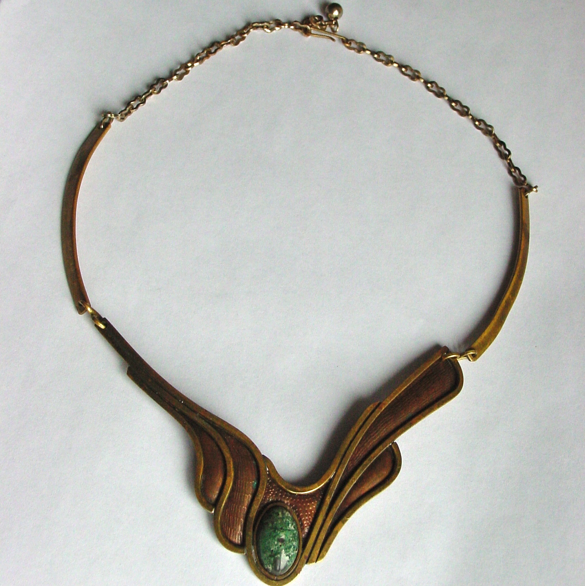 These Do Overs are not very complicated. That’s the whole idea: it’s easy to take something broken and make it new again. In this case I found a very cool studio choker. It was assembled in five sections, but one section was missing. As these artisanal pieces are usually one-of-a-kind, it was highly unlikely that I would find a matching part. Nor do I have the ability to refabricate the missing section. But I did have a section of coppery chain from a broken thermoset necklace. So I took off the fourth section of the choker, added the chain and voilà — the necklace, she is a wearable once again.