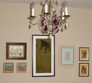 When I’m sick, I like to clean. And I am feeling poorly this evening. So I’ve cleaned off my dresser and installed a sidewalk find mirror. I had to move some art around to accommodate the mirror.