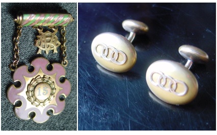 The DOS still exists, although the BOSC does not. A more well-known group (which means that there’s a lot more of there stuff out there in the world) is the Independant Order of Oddfellows (IOOF). The baubles below are a Daughters of Rebekah (the oddladies) medal and a pair of cufflinks.