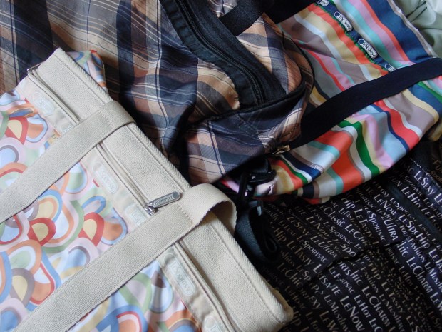I also have a nostalgic reason for covetting LeSportsac: In the early ’80s, they were something that only super cool girls possessed. You saw them in magazines or knocked off versions (I had one that was labelled DeSportrac), but not in person, not in our small city. Also, they are not cheap. My modest collection consists of bags I found in thrift shops, But my hardy weekender and stripey tote are from Winners.