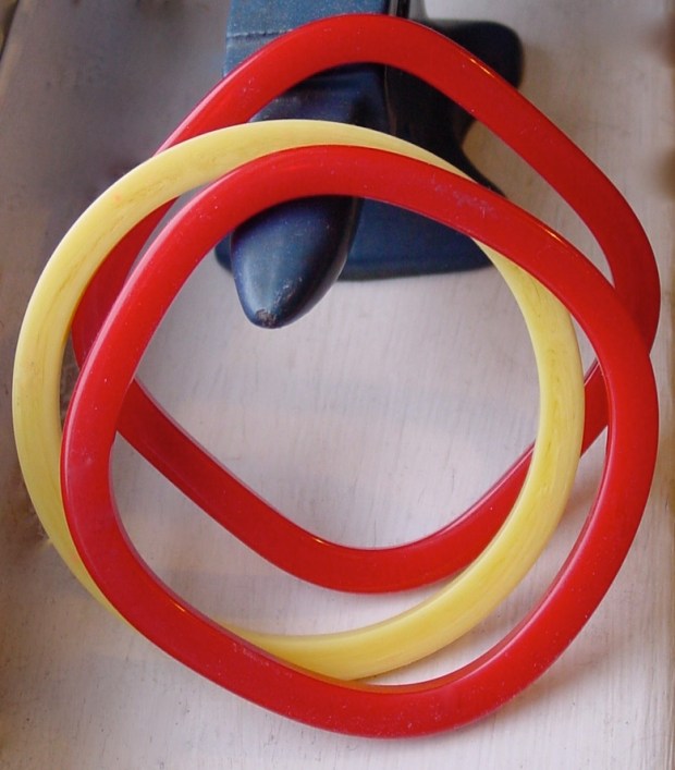 Let’s recap. Many early (pre-1930s) plastics were created in attempt to create cheaper versions of ivory (or tortoise shell or jet, in the case of gutta percha). Celluloid — a derivative of cellulose and alcoholized camphor — is one of these early plastics. When you run it under hot water, it gives off a camphor (mothball) smell. The bangles above are made of celluloid. I’m not certain when they were made, but my guess would be 1930s or 1940s.