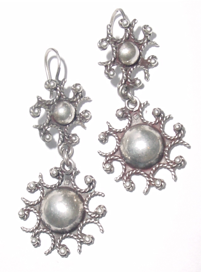 Since Egypt is in the news, I thought I’d share some of my favourite bijoux from the fertile crescent. Here are a pair of silver earrings, marked with the lotus, the national assay mark since 1946. They are quite beautiful, but are so heavy that I can’t wear them for longer than two hours.
