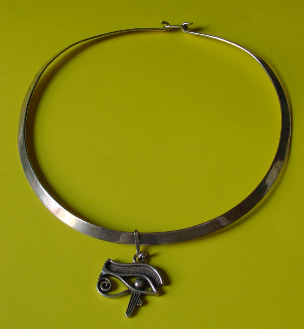 In keeping with this week’s Egyptian theme, here is a 1970s-era Mexican sterling Torc or torque necklace with an Eye of Horus pendant.