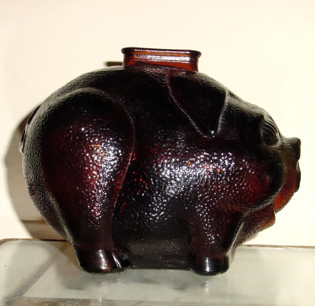 I wish I was better at thrift. I mean I’m awesome at thrifting, but I wish didn’t have so much stuff. But then I wouldn’t have this awesome amber glass piggy bank. At first I thought it was some kind of mid-century modern art glass piece, because the piggy has such long eyelashes and a hippy dippy smile. I thought it would look nice with my new decanter.