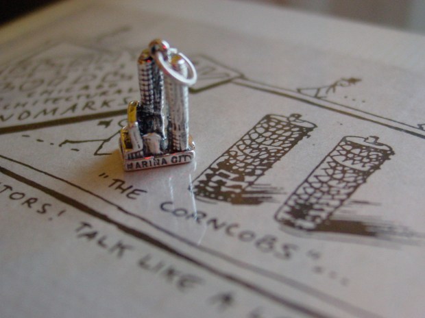Charm number 4 has arrived. It’s another building from Chi-town—Marina City! I have been enamoured of the “Corn Cobs” (you can read about their history here) since I first saw them in 1987.