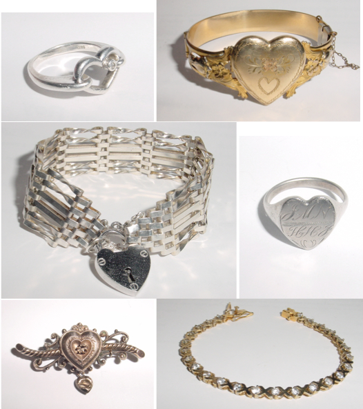 To celebrate the day, here’s a collage of some vintage and retro sentimental jewelry finds (Clockwise from top left): A silver and diamond chip ring; a Victorian revival locket bracelet; A Victorian token token ring (one of my all time favourites); A hugs and kisses tennis bracelet; A Victorian brooch; A contemporary sterling gate bracelet with heart-shaped padlock.