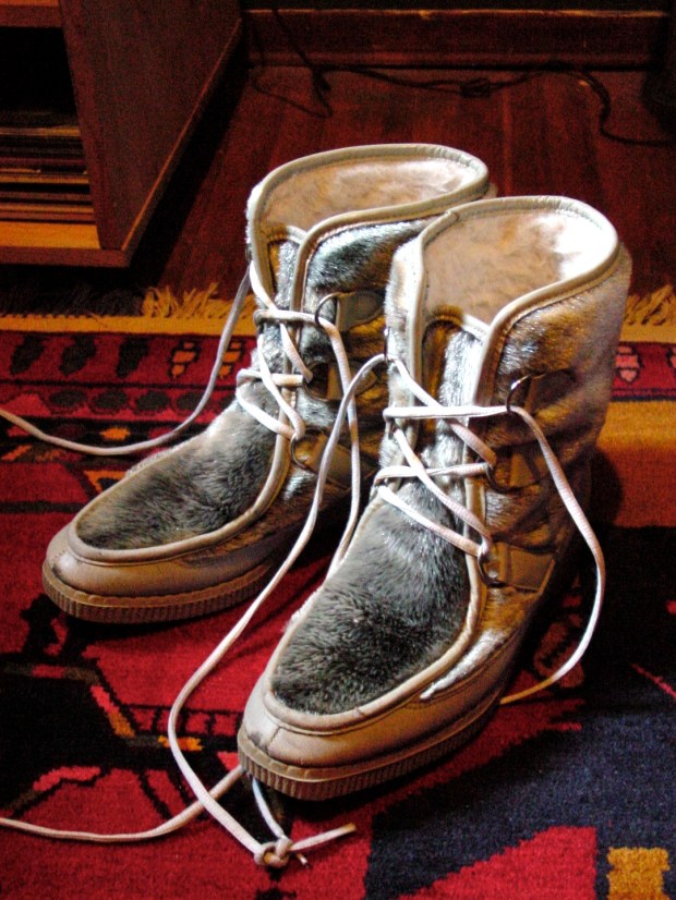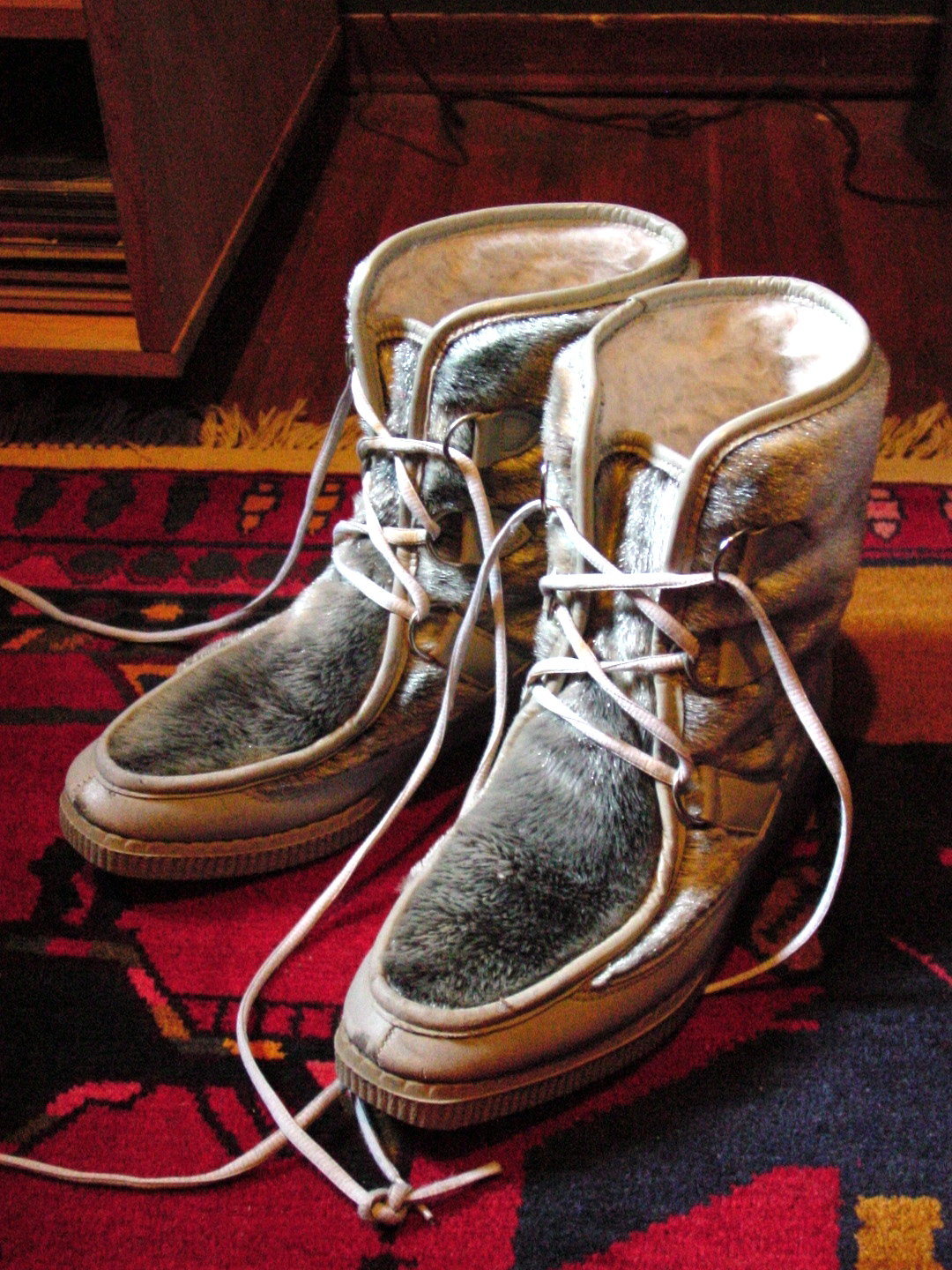 I bought these vintage sealskin boots in K-W a couple of weeks ago. It was warm when I left TO, but Kitchener being in the snowbelt and all, the boots came in handy as I trudged from my parent’s place to the bus terminal. Then I thought, “Well I better put these away for next year.” I started vacuum-packing up my winter coats but got bored before I could prep the boots. Then we had that crazy snowfall last week, so once again it was boots to the rescue. I’m pretty sure that’s it for the season, so I took a picture for posterity before they get packed up for the season.