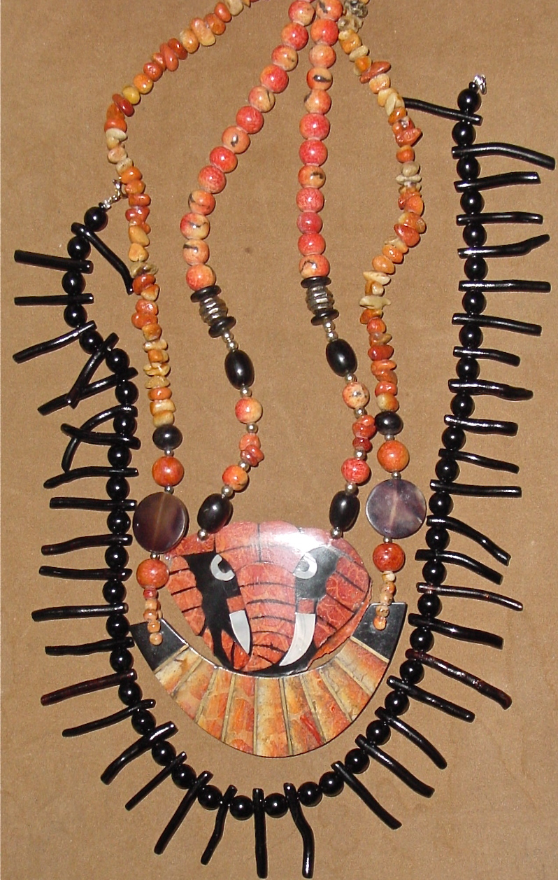 Admitting that I had a problem was the first step. I’ve cut back on hunting and really cut back on acquiring. To feed the blog, I’ve been going through the boxes of jewels I already have, doing repairs and researching things I’ve neglected, like the coral necklaces pictured above. The black branch coral is a classic design. The boho apple coral necklaces were probably made in the 80s in the Phillipines. The elephant face is made by affixing the coral slices to vinyl.
