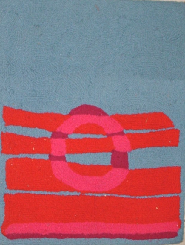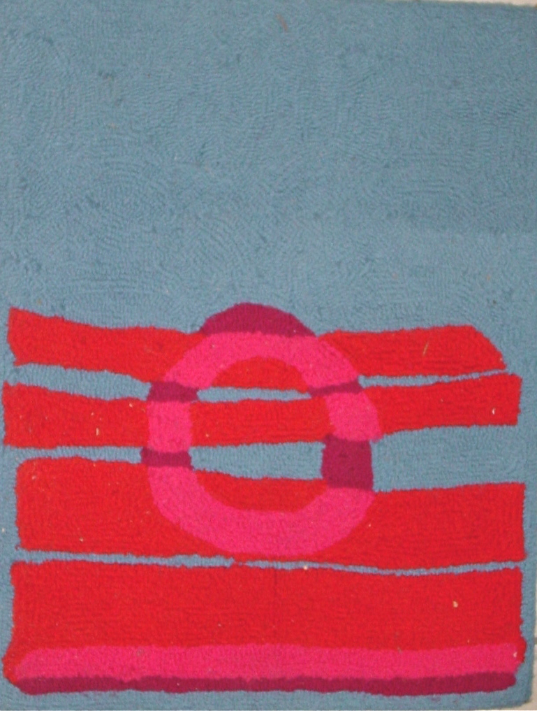 I’ve always wanted a handmade hooked rug. I appreciate their sturdiness as well as the hours of labour that must go into each little carpet. And I admire the Resourcefulness of the happy hookers themselves — using up bits of scrap yarn and fabric as their materials. I’ve not got one before now because: 1. The designs are usually a little too flowery to go with our décor, and; 2. They are usually out of my price range.But this weekend, I found this abstract model at the annual Trinity Bellwoods Yard Sale. And it only cost $5.