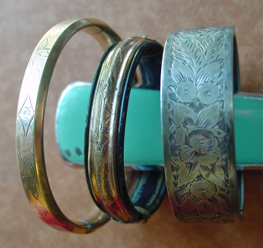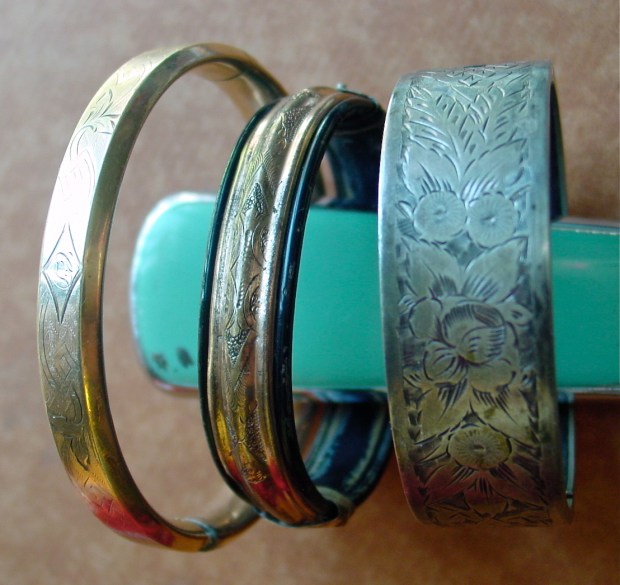 What I’m trying to say is that today’s post is a very lazy one. I’ll I’ve managed to accomplish is taking a photo of three very shabby, Victorian-era hinged bangle bracelets. Two have broken closures, one is losing it’s enamel. I’ve enquired about having them repaired, but no one seems willing to do it because, monetarily, they aren’t worth the effort. I feel badly for them and keep them near, waiting for the day that science invents a laser that can make quick, inexpensive repairs on cheap old jewelry.