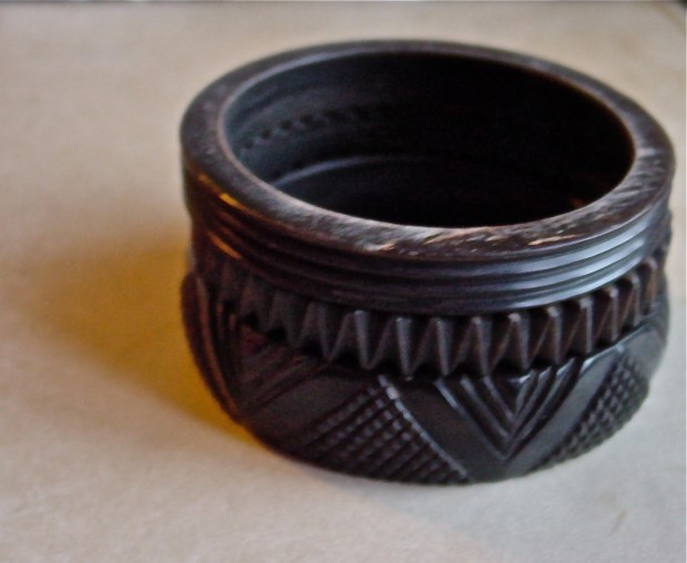 I have a thing for carved horn bangles. I like to pile them on or pair them with carved lucite or gold bangles. Maybe it’s because my dad worked at J.M. Schneider’s and used to bring home cow horns and carve them into things. I remember a fish and a gun powder holder thingy. If you’ve been following this blog for the past two years, you probably already know that I don’t have the most PETA-friendly jewellery collection.The evidence is here; here; and here.