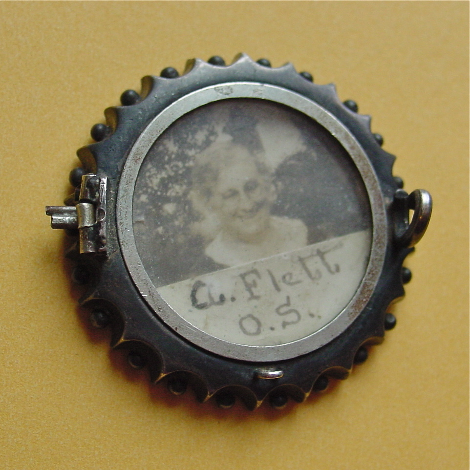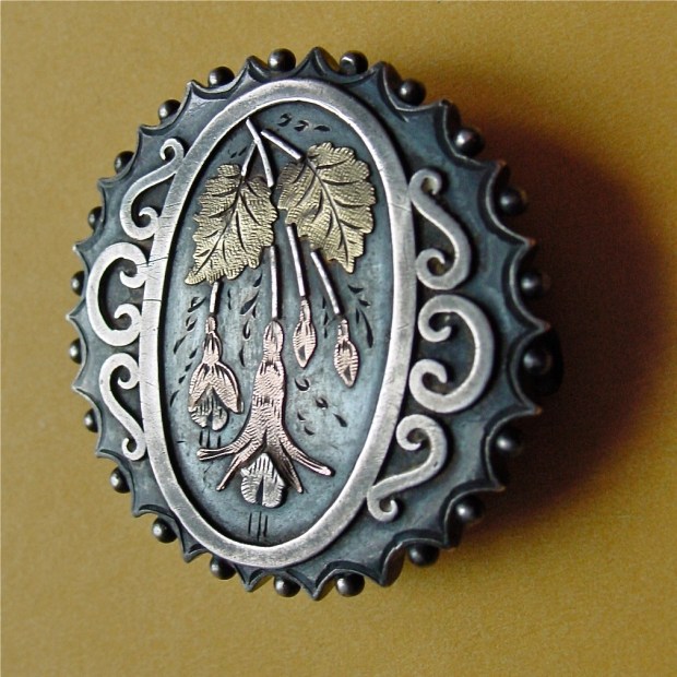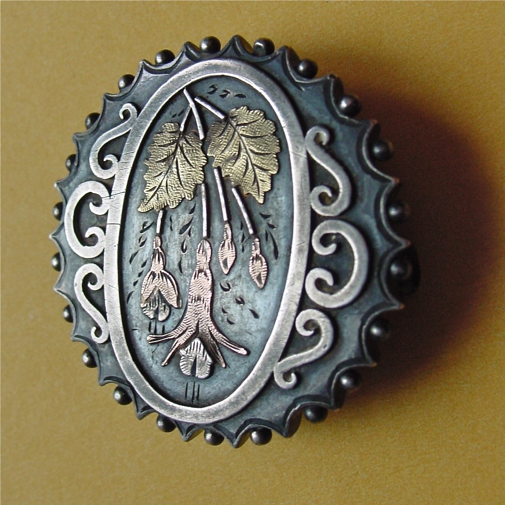 Another $2 find from the St. Lawrence Antique Market. That place is a candy shop, I tells ya! I love this lady A. Flett, O.S. She looks so happy and I just want to hang out with her all the time (although the T-bar pin back is broken — I’ll have to see if I can get it fixed). Even more beautiful than her smile is the front of this brooch with its yellow and rose gold inlaid fuchsias (at least I think they’re fuchsias).
