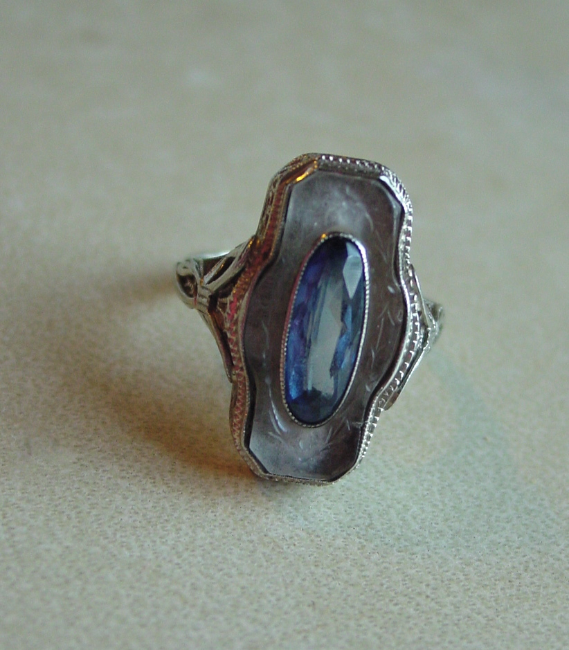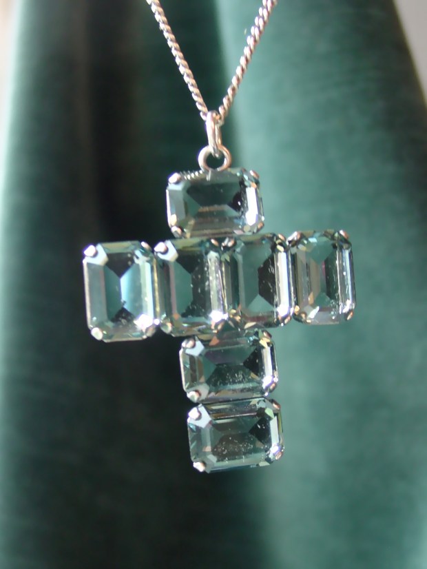 The same thing is happening in my jewellery box. As witnessed by the white gold Edwardian (maybe) sapphire and rock crystal ring pictured above, the retro emerald cut aquamarine pictured below and the openback crystal cross pictured below that.