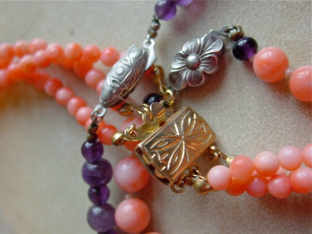 Look at these vintage necklace clasps. Aren’t they beautiful? I found the répoussé clasps in bags of broken jewellery and saved them for years until I found the amethyst and coral beads that were worthy of these closures. I love the design and the craft of these tiny silver pieces from (I think) the turn of the 19th century.