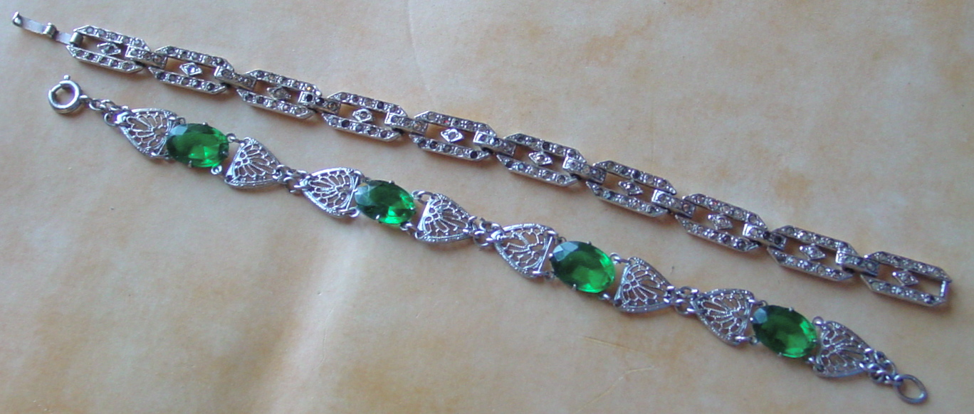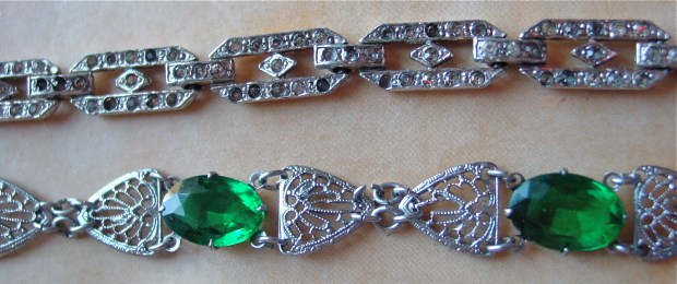 Two costume Art Deco bracelets, one from the Value Village, the other just arrived from eBay. I believe them both to be Rhodium plated. Rhodium is a member of the platinum metals group (which also includes platinum, palladium, ruthenium, iridium and osmium). It was admired in the Deco era for it’s super shiny, chrome-like finish.