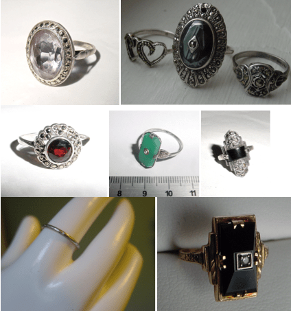 Here are some Art Deco rings that I have owned — or continue to own (clockwise from top left): Silver and pale amethyst and marcasite ring; sterling and marcasite double heart ring; sterling and onyx marcasite ring; silver marcasite ring; sterling and onyx marcasite ring; 10K gold, onyx and diamond ring; platinum Traub Orange Blossom wedding band; silver Bohemian garnet and marcasite ring and sterling and chrysoprase glass ring.