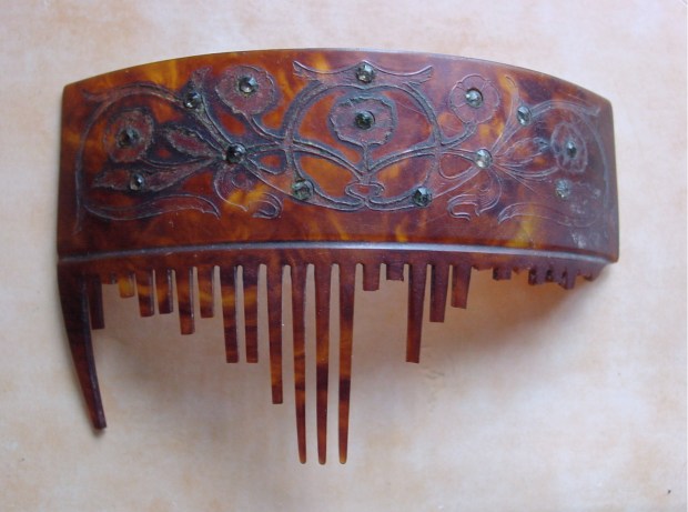 Got this destroyed celluloid hair comb or or peineta in the free stuff box outside of Gadabout. I bet I can make something out of it, but it also has a certain charm in it’s dilapidated state.