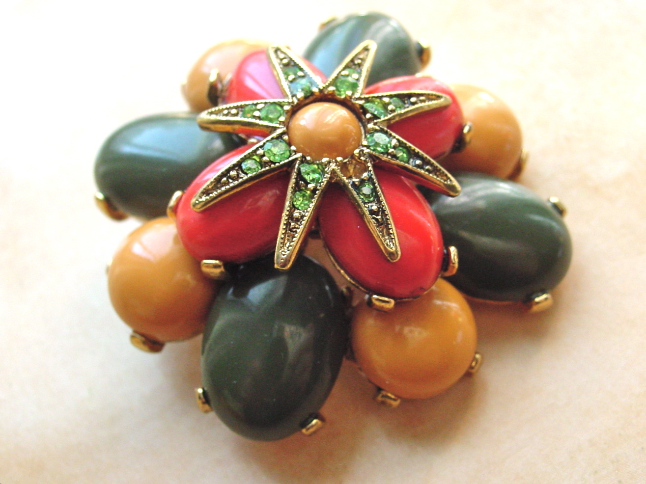 Welcome to fall! Here’s a pretty no-name brooch I’ve had for a while. I don’t know how old it is — it could even be one of those Banana Republic vintage-look pieces that came pout about five years ago. But it also reminds me of 1970s-era Sarah Coventry. At any rate, it;s very attractive with its autumnal colours.