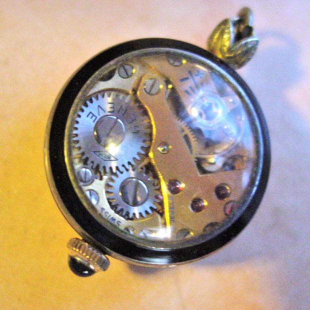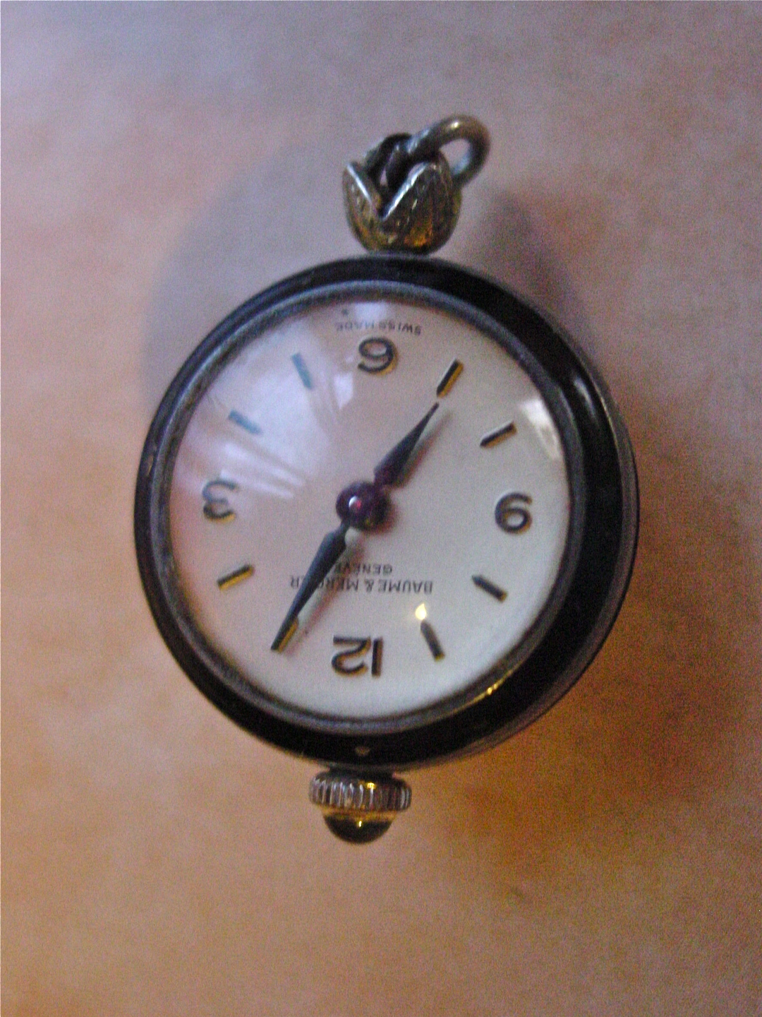 I got this pretty package in the mail Tuesday. It’s a Baume & Mercier enamel pendant watch from the 1940s. I won it on eBay. I paid too much for it (though it was part of a lot), especially considering that I did not know if it would work or not. But it does and it’s so dainty and pretty like a jewel that keeps time. I had been looking for a ball watch of this era, especially one with a see-through back so I could watch the movement ticking away.