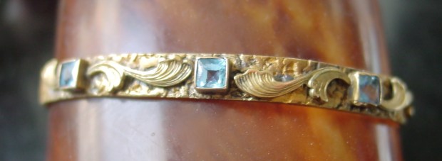 Another mystery jewel: Don’t know what it’s made of, don’t know when it was made. The clues: The blue paste stones are bezel set with an open back setting and the scrolled flourishes (which look late Victorian) are applied onto a nuggety-textured finish (which looks very ’70s). One of the flourishes is missing a wing but I don’t see a break. It is well made and cheaply made at the same time. The metal is very soft — maybe gilt silver? If anybody has any ideas, let me know.