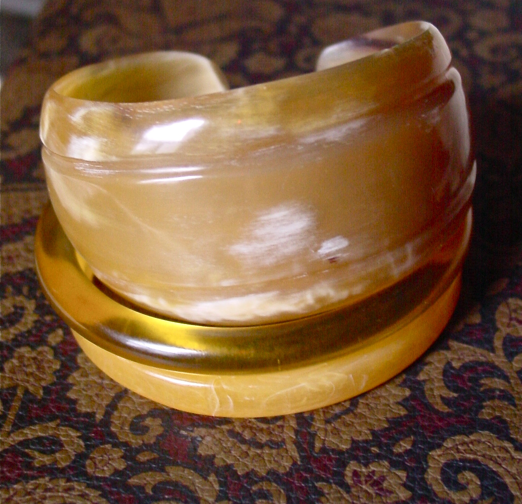 I’ll start with three bracelets that I picked up at the CAFTCAD sale last Saturday (more on that later). Thematically they are linked by colour. Alone, one is a clear, space age number, one is a carved horn cuff from Mauritia, and the third is possibly celluloid mimicking amber. Together, they are awesome.