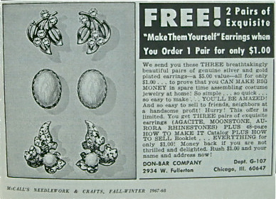 When perusing through old women’s magazines, you will often come across ads like these, promising the tools you need to make money at home by creating your own jewellery. This one is from McCalls. In the Patti Smith book Just Kids, she mentions that Robert Mapplethorpe used to help his mother out with such projects. I wish I could make money at home making jewellery. November will be the month that I open up an etsy shop. I swear it!