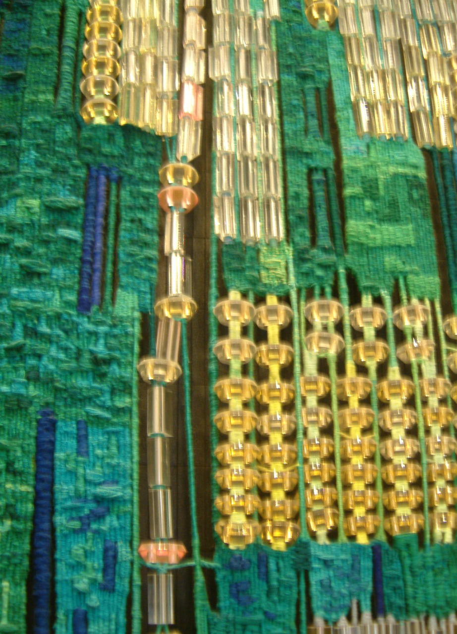 The public is still free to roam the main floors of the buildings and visit the permanent collection. The complex is also home of the John B. Aird Gallery. And there are also works by famous folks like A.J. Casson, Jack Bush, Harold Town, E.B. Cox, York Wilson, and Paulosie Kanayook. But I like to look at the site-specific pieces like the stained glass windows or the bright and colourful mixed media works, like the piece by fibre artist Micheline Beauchemin shown below.